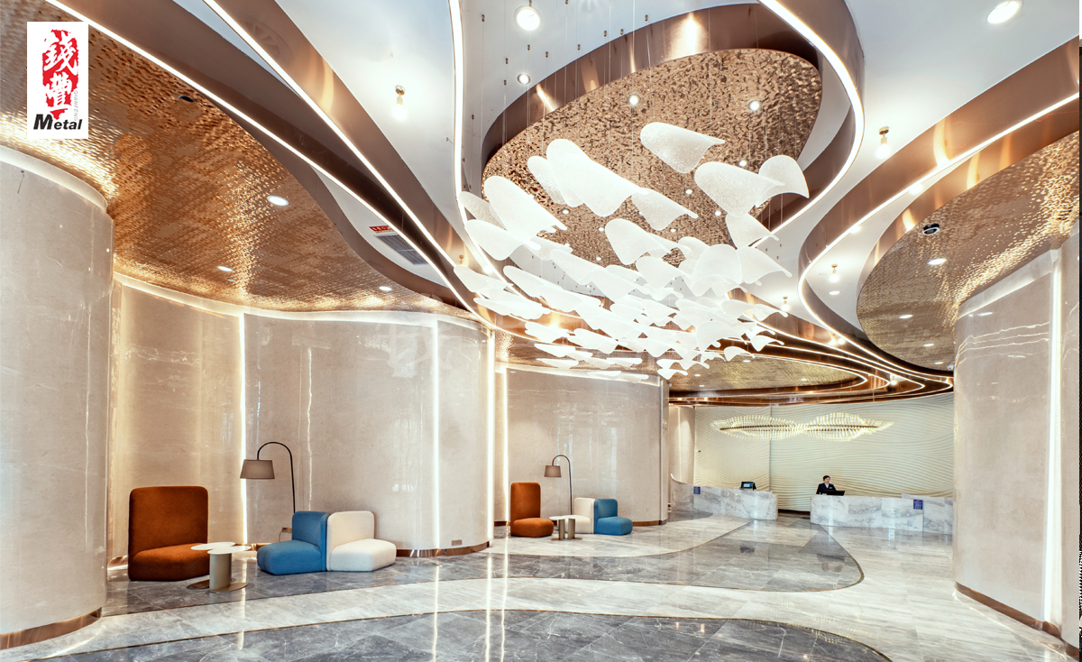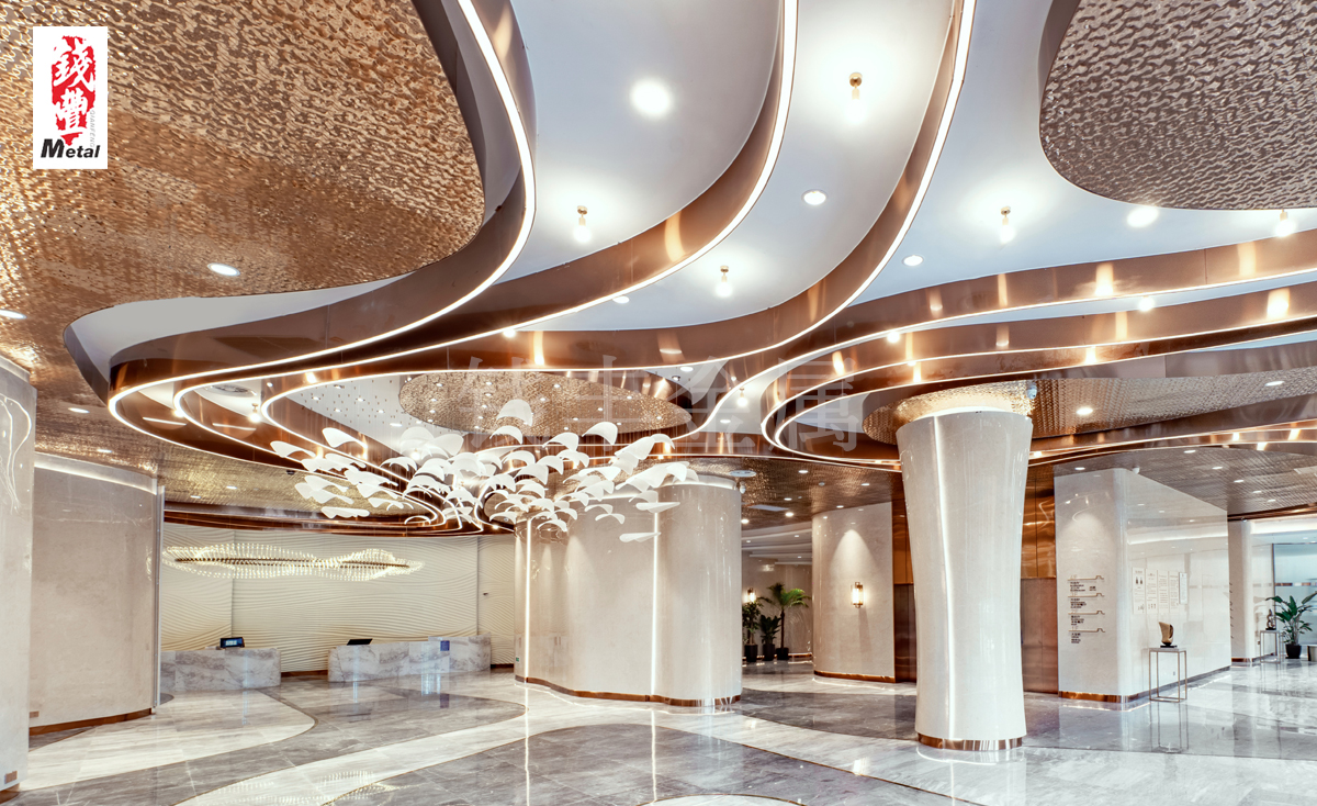 總的來說,不銹鋼水波紋板在高檔會所的天花板吊頂上的應用,能夠帶來藝術感和現代感,展現出豪華和精致的氛圍,同時還具備耐用和易清潔等優點,為會所空間增添獨特的視覺效果。